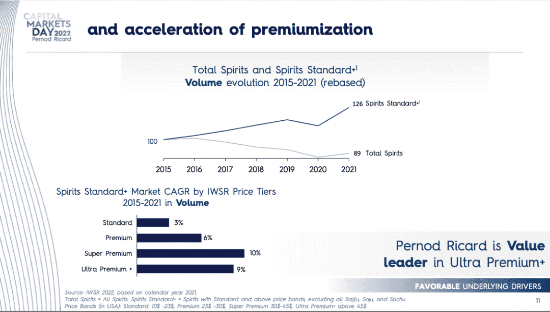 这一点即使在疫情后也没有改变,马爹利与芝华士的增长仍旧起到了关键性作用。与此同时,保乐力加所有品类的渗透率都有提升。2016-2021年,保乐力加全品类的增长率从10%增长至20%、干邑从4%增长至7.5%、威士忌从4%增长至6%。