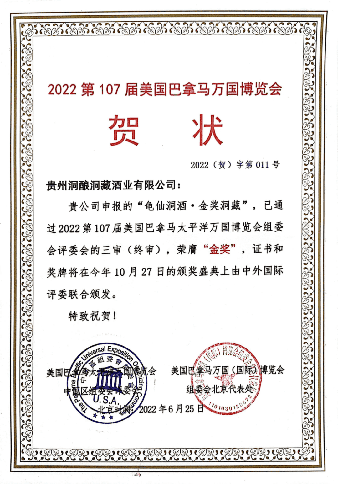 6月25日,贵州国帅酒业集团有限公司收到一封来自美国巴拿马万国(国际)博览会的贺状,旗下龟仙洞酒·金奖洞藏已通过2022第107届美国巴拿马太平洋万国博览会(以下简称“巴博会”)组委会评委会的三审(终审),荣膺“金奖”。消息传出,公司全体员工和各地酒商们欢呼鼓舞,销售市场一片沸腾,引发行业广泛热议。
