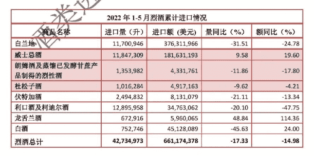 《2022年1-5月酒类进口市场情况》显示,1-5月,烈酒进口量4273万升,进口额6.6亿美元,量额降幅均处15%以上,整体数据与一季度相差不大,主要在于细分品类内部之间的竞争转化。