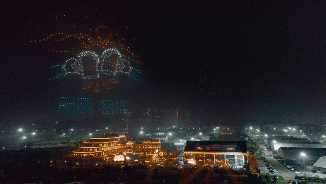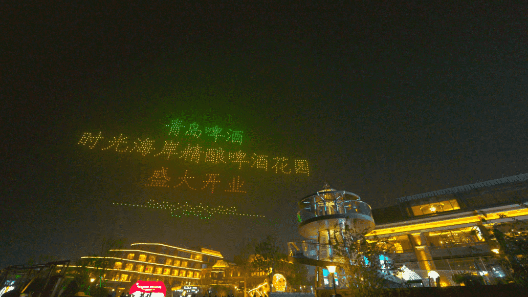晚上,青岛啤酒·时光海岸精酿花园里的“自在好时光”仍在继续,夜空也跟着沸腾。一场绚丽夺目的无人机编队表演,精酿啤酒花园建筑造型的复刻、啤酒主题的六大时尚业态等12幅画面逐一闪现在夜幕中,打造了一场专属于中国啤酒之都的“星空奇景”。