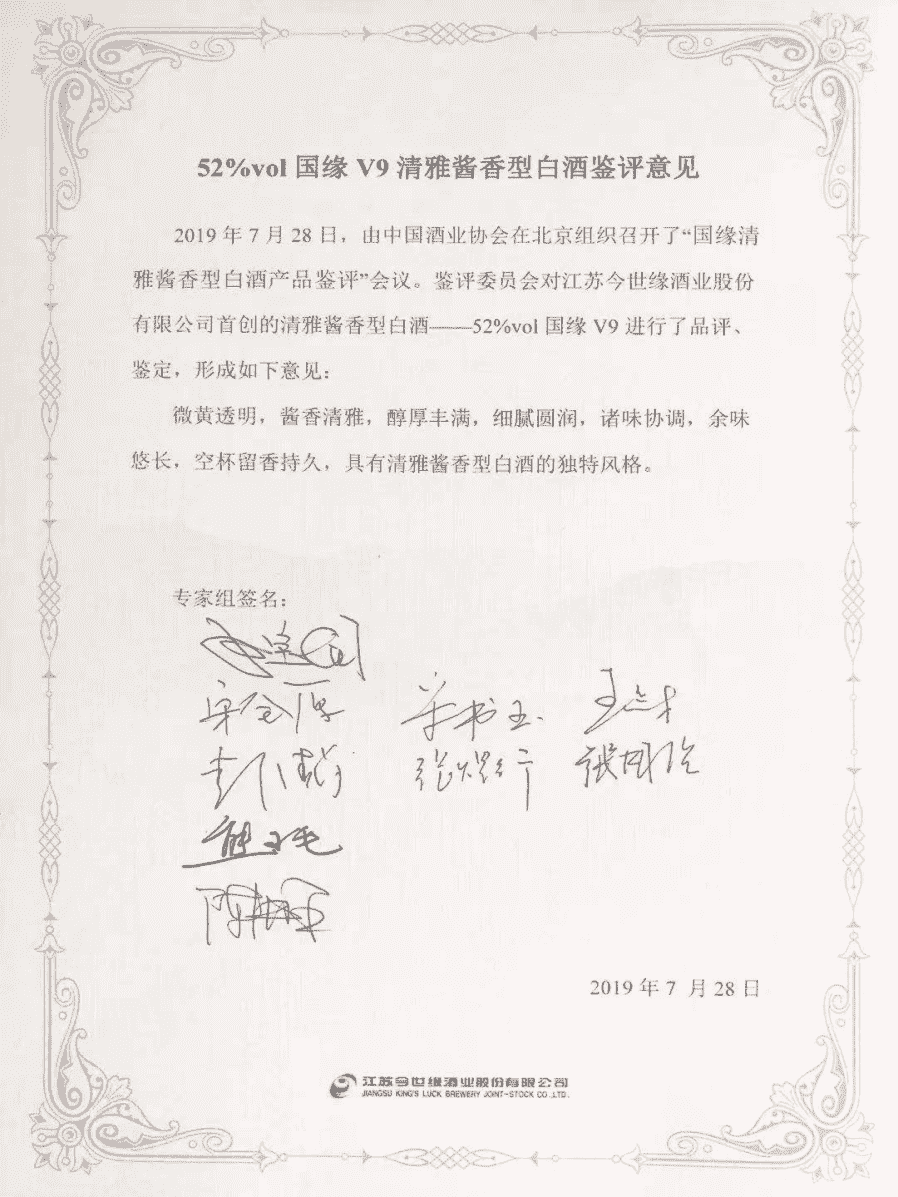 2019年7月,就在国缘V9上市的前一个月,V9清雅酱香型白酒通过国家鉴定,中国酒业协会鉴评为:微黄透明,酱香清雅,醇甜圆润,细腻柔滑,诸味协调,空杯留香持久,具有清雅酱香型白酒的独特风格,并获得鉴定证书。