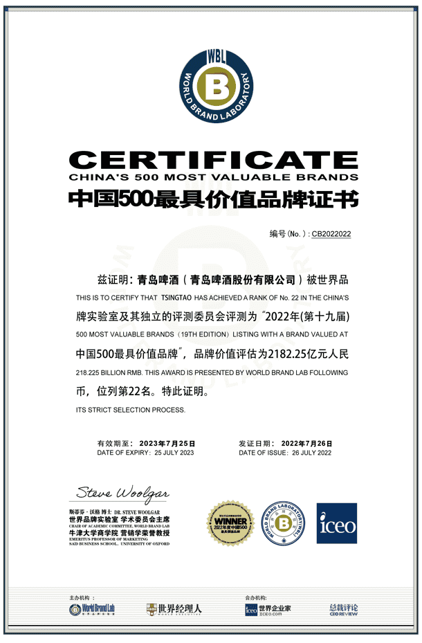 7月26日,世界品牌实验室在北京主办的“世界品牌大会”,现场发布2022年《中国500最具价值品牌》榜单显示,青岛啤酒的品牌价值达到2182.25亿元,首次突破两千亿元,连续19年蝉联中国啤酒行业首位。