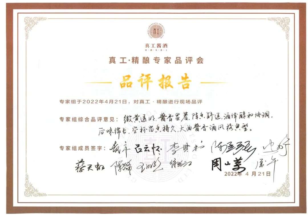 当时,贵州省酿酒工业协会理事长、贵州省白酒专家委员会秘书长黄平,知名白酒专家、贵州省首届酿酒大师李其书,遵义市(仁怀市)酒业协会会长吕云怀等多位知名专家,现场品评并给出了“微黄透明,酱香显著,陈香舒适,酒体醇和协调,后味绵长,空杯留香持久,大曲酱香酒风格典型。”的评语。