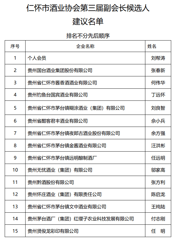 当天上午,经过无记名投票选举,仁怀市酒业协会第三届理事会成员诞生: