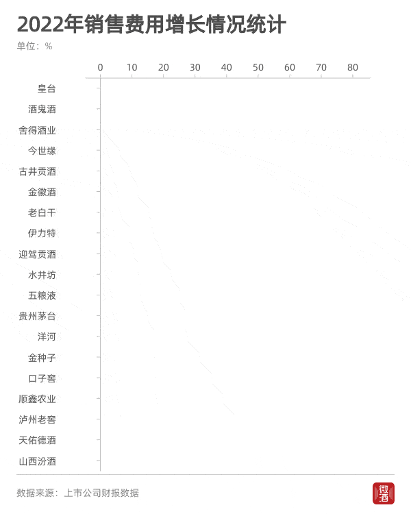 总的来看,19家上市酒企在今年上半年普遍加大了销售费用支出,除汾酒和天佑德外,销售费用均呈现正增长态势。其中,有13家上市白酒企业的销售费用呈两位数增长,皇台、酒鬼酒、舍得酒业的销售费用增速更是超过50%。