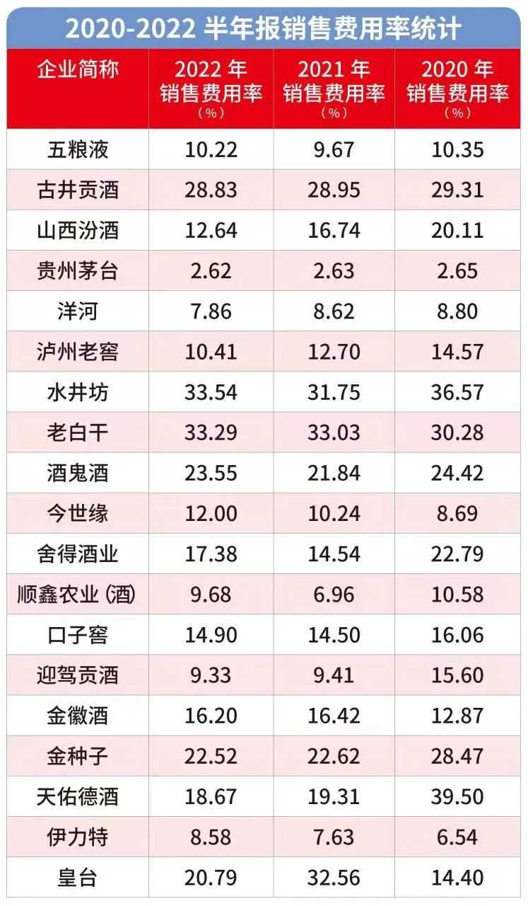 今年上半年,19家上市白酒公司销售费用总额为176.16亿元,比去年同期增加了24.87亿元;19家上市白酒公司总营收1814.79亿,整体的销售费用率接近10%。