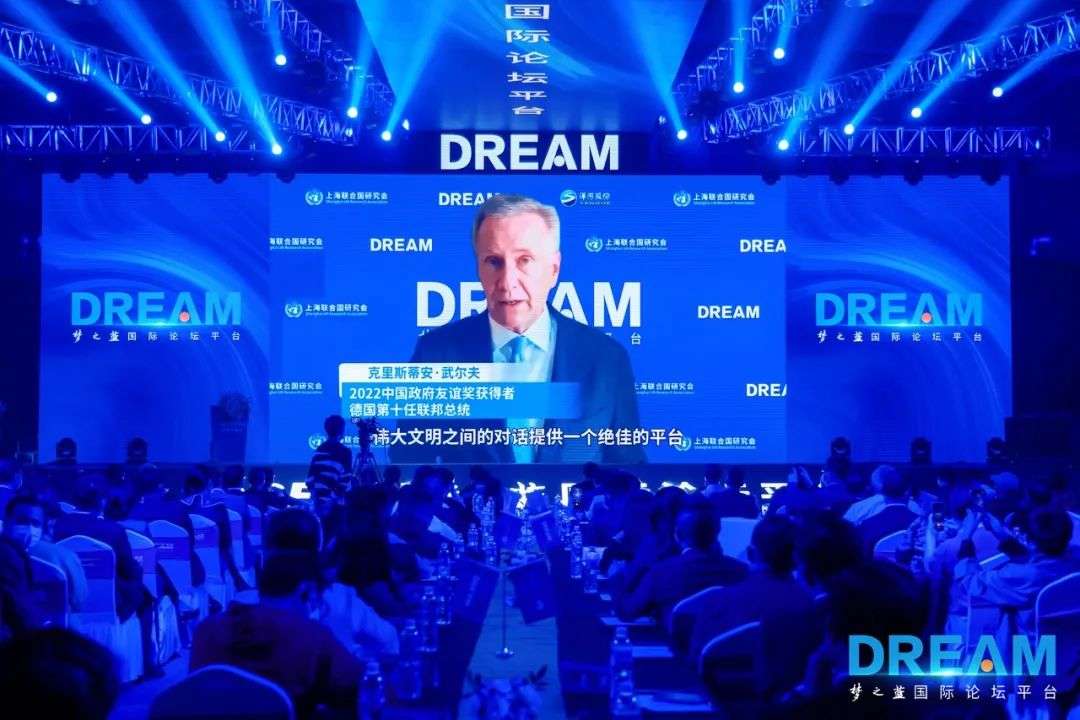 2022中国政府友谊奖获得者、德国第十任联邦总统克里斯蒂安·武尔夫发来视频祝贺:“DREAM国际论坛的创办将为世界各国伟大文明之间的对话提供一个绝佳的平台,不仅是一个深化加强各国既有的合作关系的机会,也号召我们建立一个更美好和谐的世界。”
