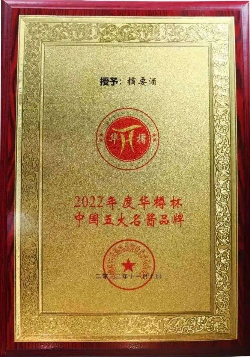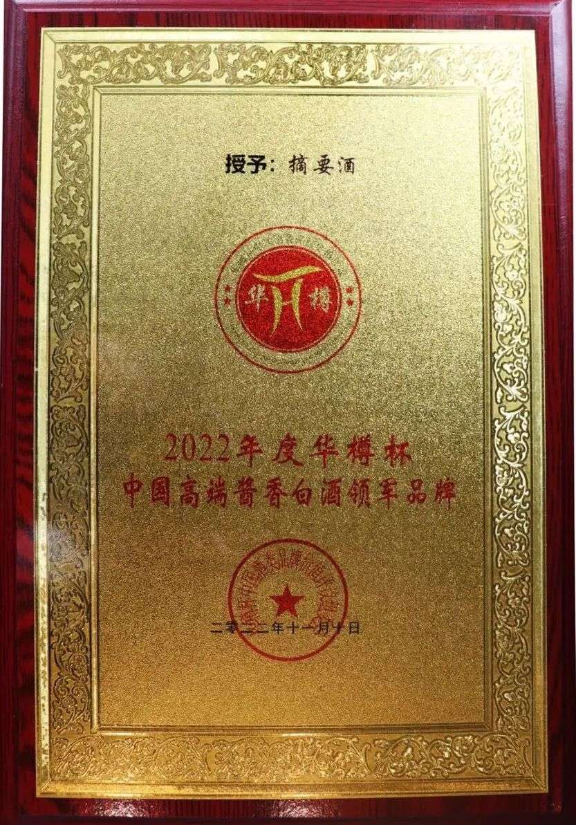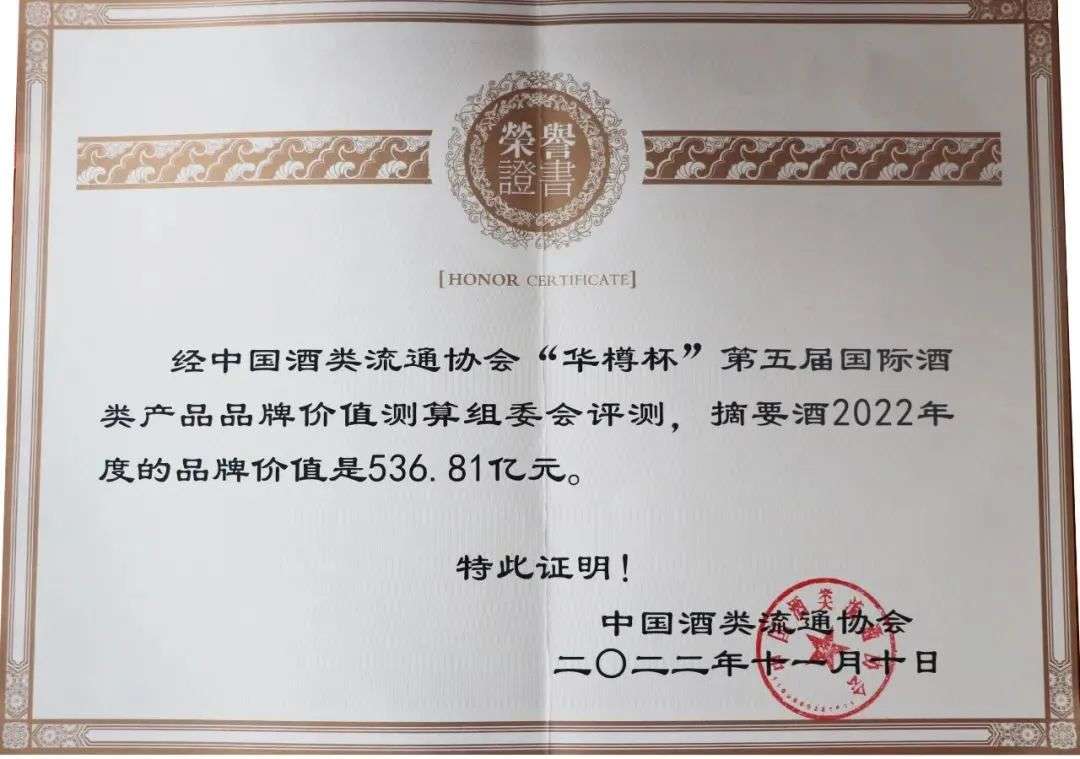 摘要酒荣获2022年度华樽杯中国高端酱香白酒领军品牌、2022年度华樽杯中国五大名酱品牌,2022年度品牌价值为536.81亿元。