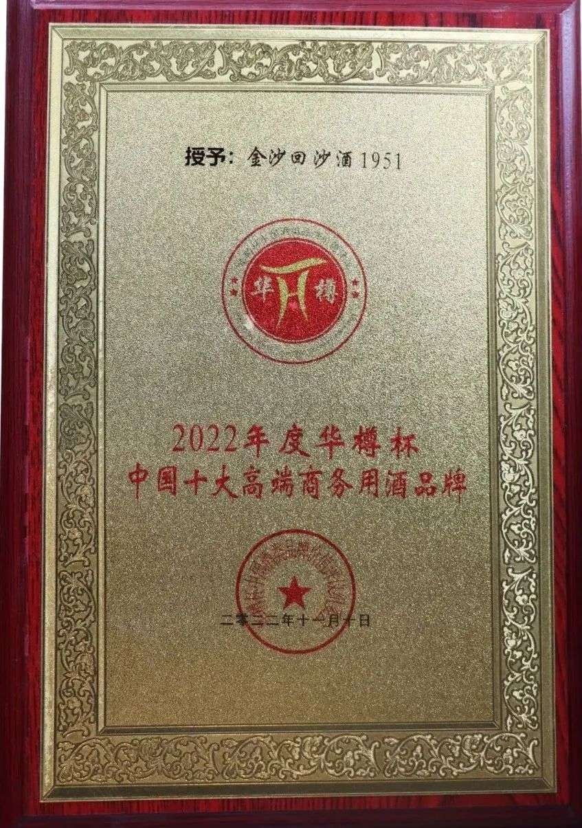 金沙回沙酒1951荣获2022年度华樽杯中国十大高端商务用酒品牌。