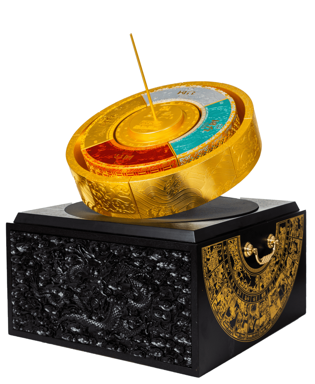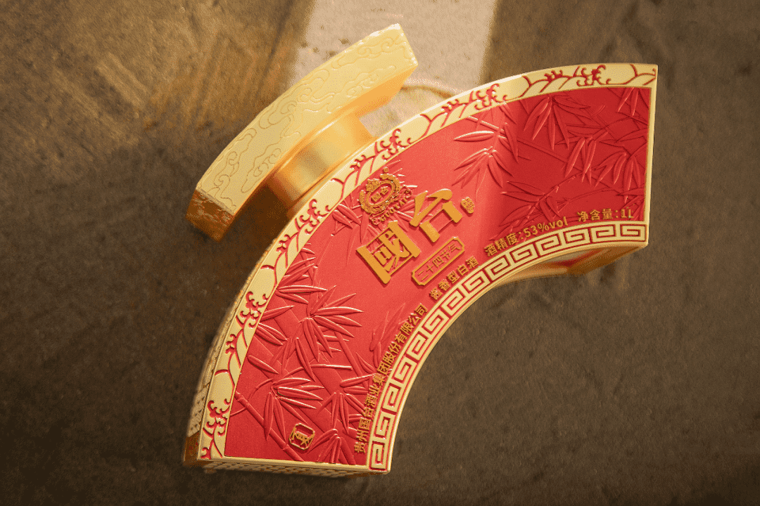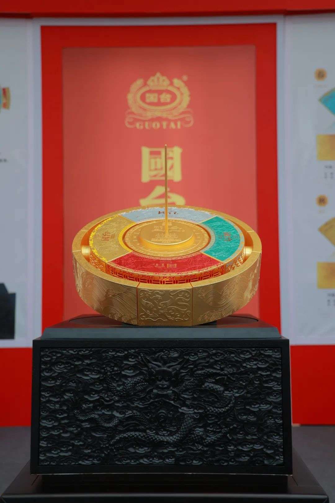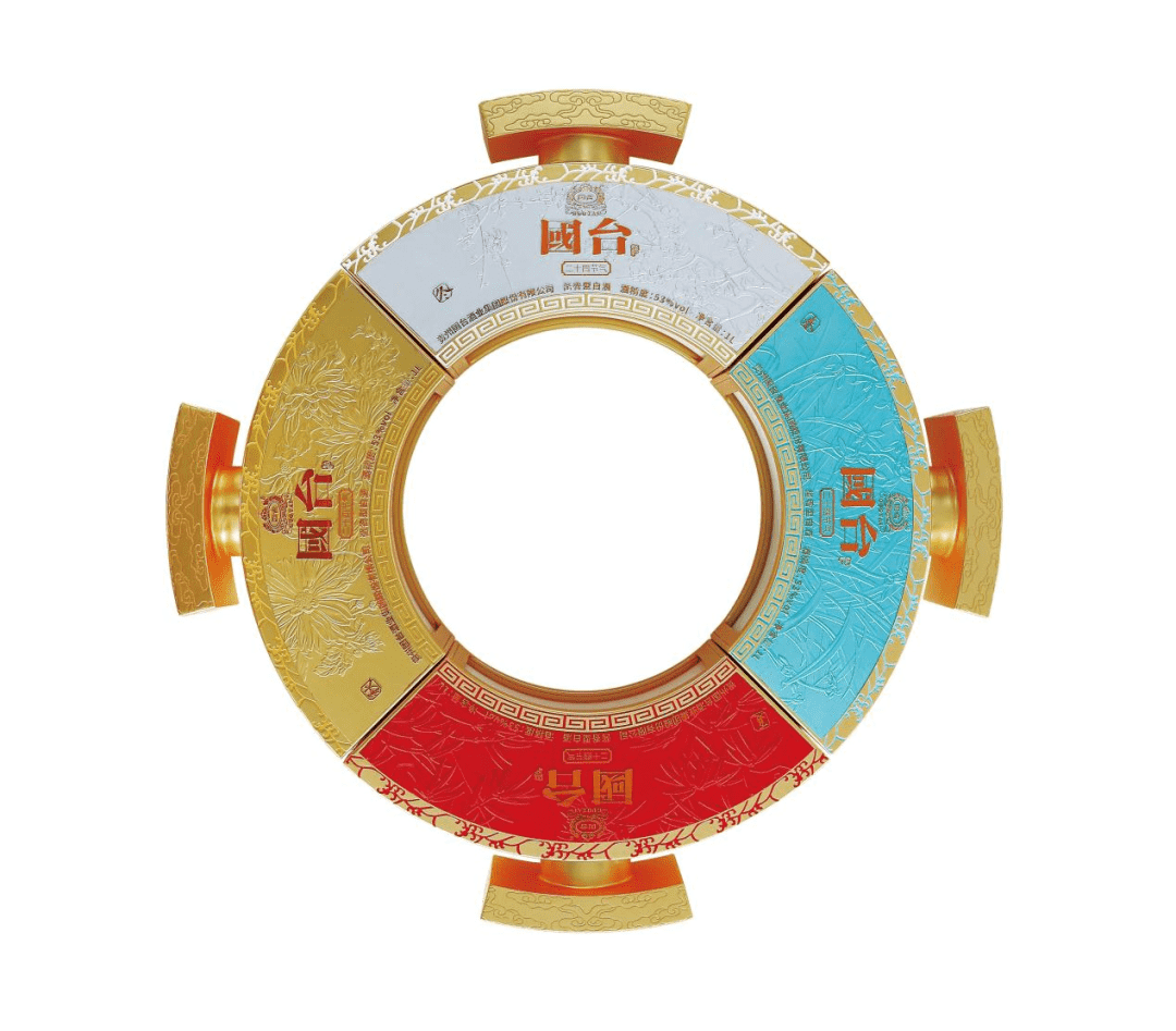 当酒瓶与木箱合体展示时,呈日晷形状。外层云纹环绕,为“天”;中层水纹环绕,为“地”;回纹环绕,为“循环往复”;“二十四节气”酿酒图环绕,为“人”;内层天干地支环绕,为“道”。一层层纹样围绕国台酒向心而聚,象征“岁月循环、周而复始、天人共酿、以酒载道”,其结构特点寓意中国古老“乾坤”、“天人合一”的哲学思想。