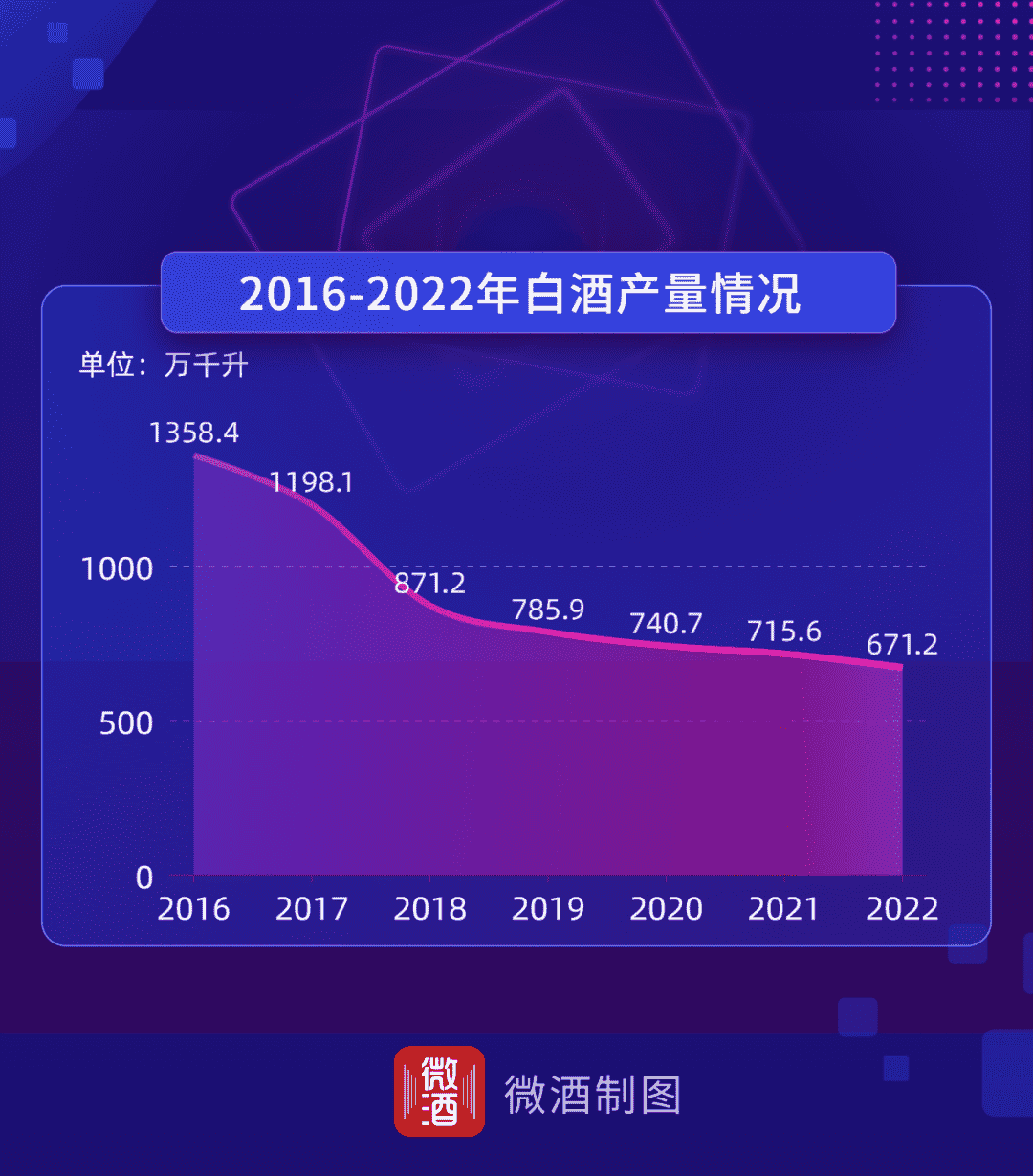 2016-2022年,白酒产量分别为1358.4万千升、1198.1万千升、871.2万千升、785.9万千升、740.7万千升、715.6万千升和671.2万千升,出现了连续6年的“6连降”,2022年,白酒产能相比巅峰期萎缩一半以上。