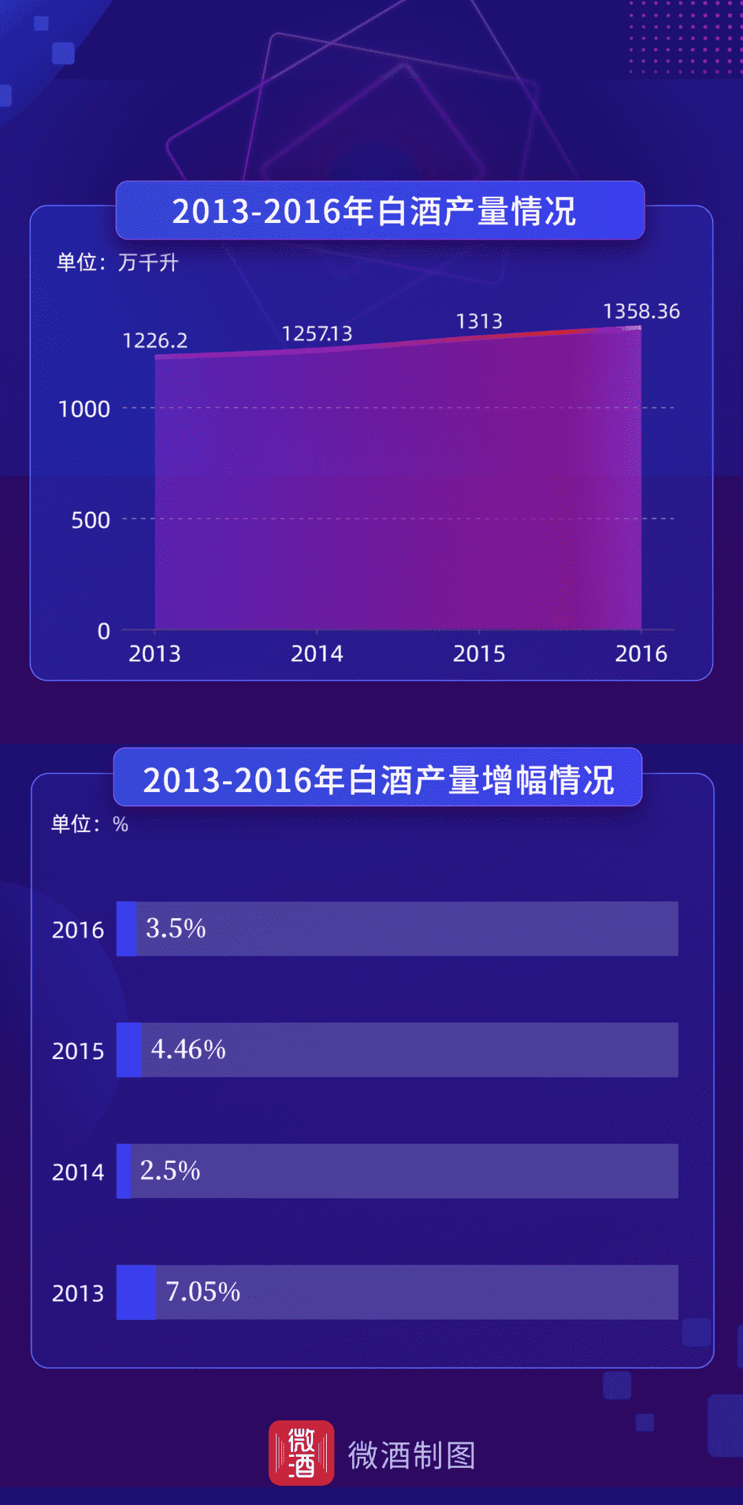由于产能释放与产业调整有2-3年的错峰期,因此,2013-2016年,白酒产量仍保持正增长。2013年,白酒产量为1226.2万千升,同比增长7.05%;2014年,白酒产量为1257.13万千升,同比增长2.5%;2015年,白酒产量为1313万千升,同比增长4.46%;2016年,白酒产量1358.36万千升,同比增长3.5%。