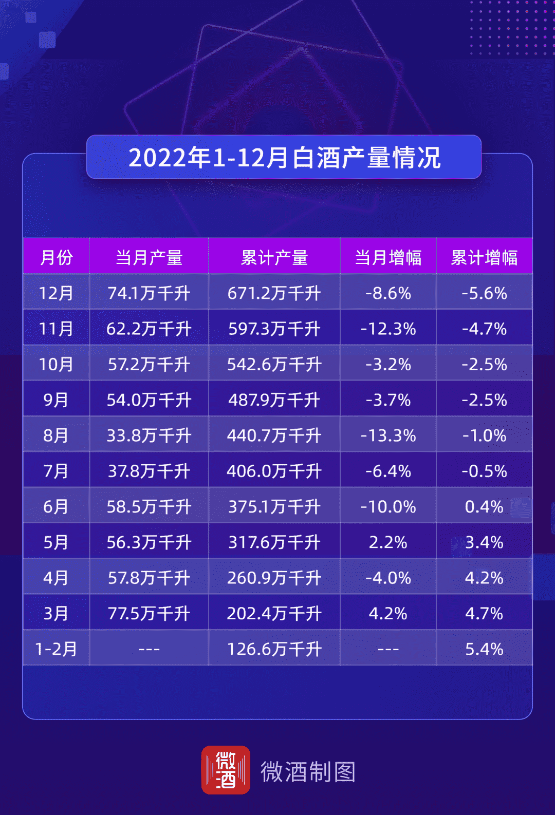 近期,国家统计局发布数据显示:2022年,全国白酒产量为671.2万千升,同比下滑5.6%。白酒产量延续了负增长的态势,且下滑幅度较2021年(-0.59%)更大。