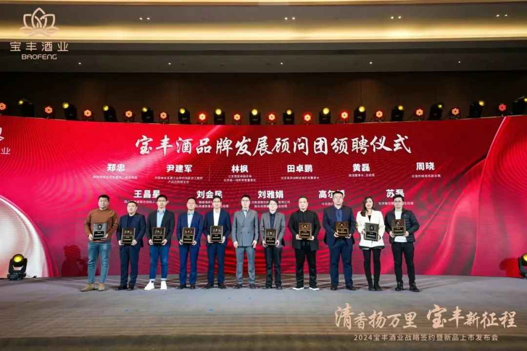 令人惊喜的不止于此,本次发布会还成立了“宝丰酒品牌发展顾问团”。该品牌发展顾问团由行业协会领导、浙江商源集团与名品世家两家头部大商、全国经销商代表、行业咨询专家、媒体代表共同组成,旨在为宝丰酒业提供市场调研、品牌定位、品牌形象塑造等方面的专业支持和指导,参与宝丰酒业共同制定品牌发展战略和营销策略,推动宝丰酒业不断提升产品质量和服务水平,助力宝丰酒业打造为具有国际竞争力的百年清香型名酒品牌。